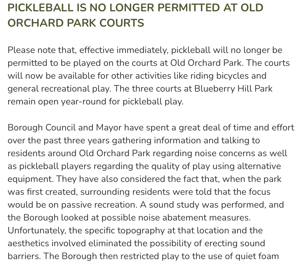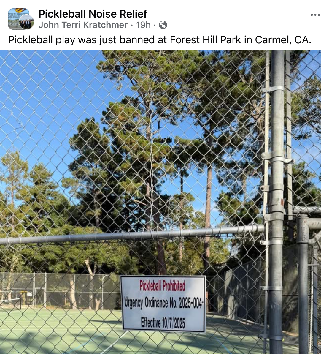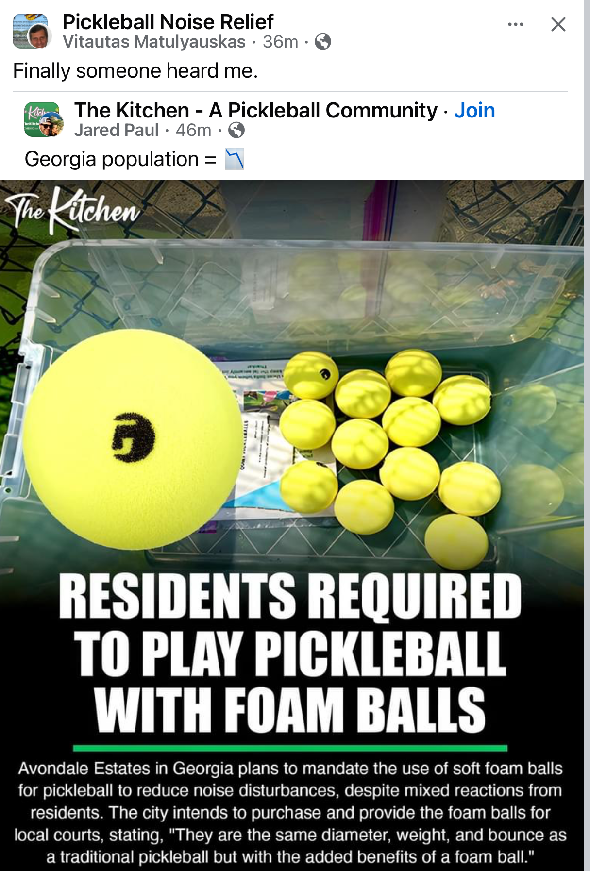 We are not the only community with a pickleball noise problem. See the photos below. In some situations, the quiet ball is required. In other areas, they have prohibited pickleball entirely, sometimes in response to a court order.